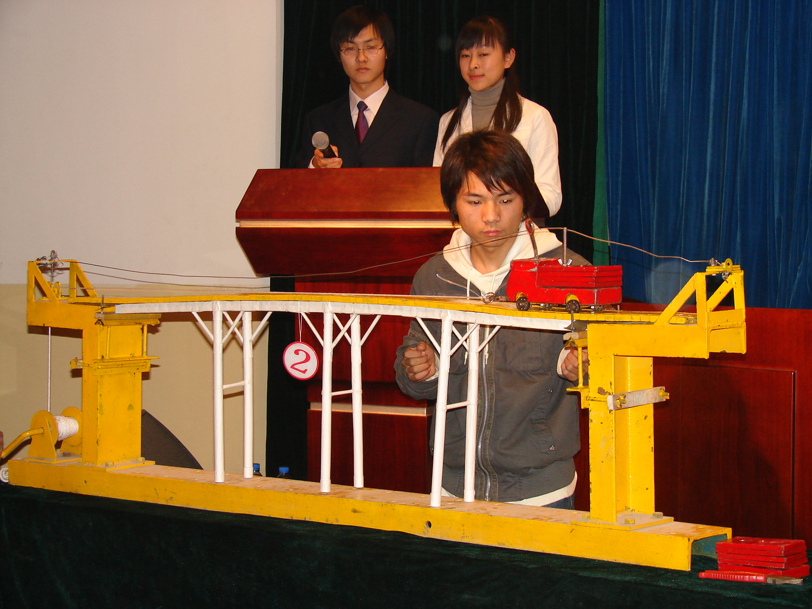 接着进行的是承载力优胜奖的评选。这次决赛方式较以往有所不同,允许参赛选手有两次机会自行选择附加重量进行加载,并根据模型承受的荷载与模型的本身的重量之比来进行评分,因此,这对参赛作品的承重能力有了更高的要求,大赛也具有了更高的可观赏性。