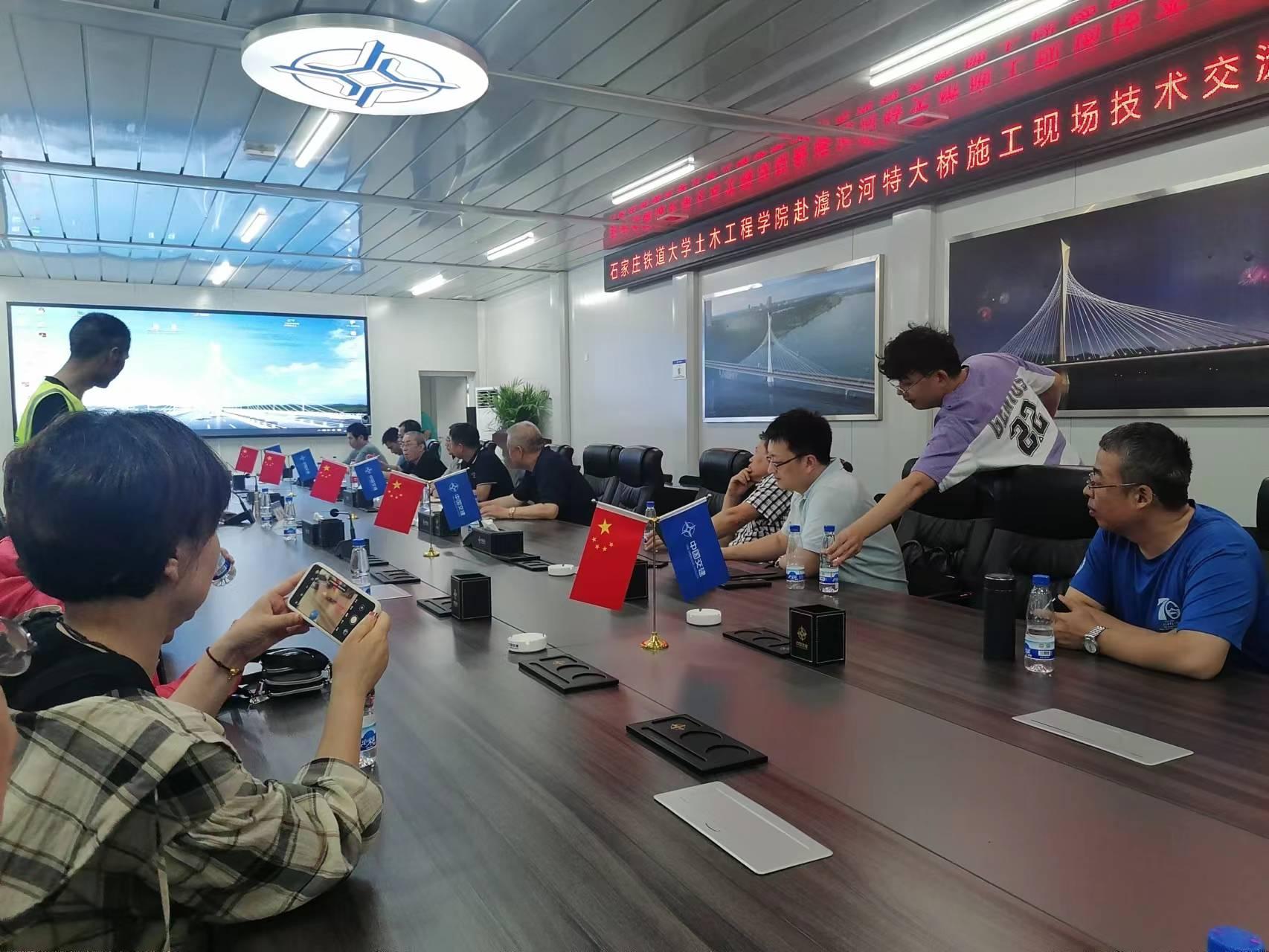 现场观摩后的座谈会上,中交第二公路工程局有限公司联合体石家庄市复兴大街城区节点市政化改造工程项目经理部总工郭瑞介绍了滹沱河大桥工程特点、关键技术、施工组织安排、项目部党支部组建等;张耀辉副院长就金年会官网基本概况,特别是桥梁工程学科发展、科研成果、专业优势以及党建活动等与对方进行了深入交流。双方表示,将以学习贯彻习近平新时代中国特色社会主义思想主题教育为契机,通过 “党建引领促发展”活动,不断拓展交流合作的广度和深度,充分发高校的智力优势以及企业的技术优势,促进双方行业与专业互动、理论与实践结合,实现校企合作共赢。