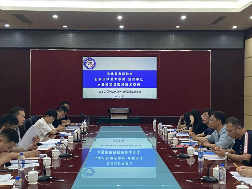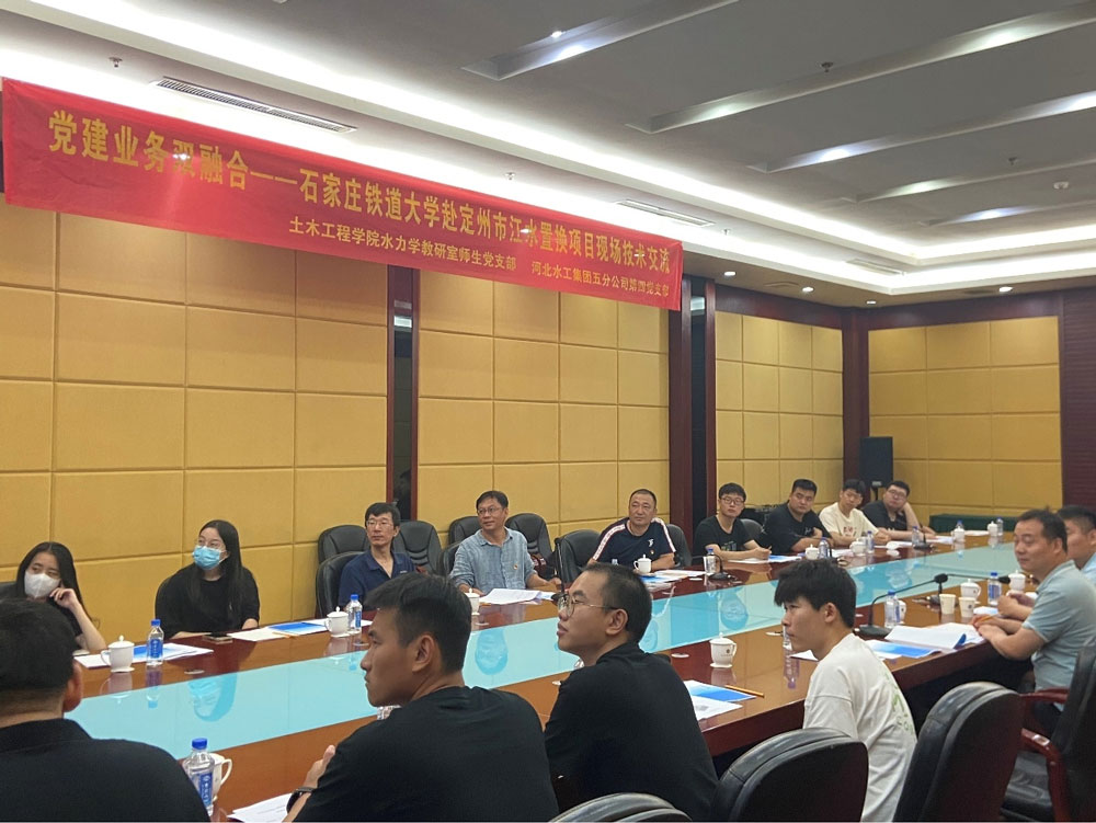 随后,双方召开了座谈交流会。会上,河北水工局五处高翔处长就河北省水利工程局历史沿革、主要业绩成果、获奖情况、未来发展规划等情况进行了介绍,水力学党支部李鑫就水力学教研室基本概况、近年来团队研究方向、研究课题、主要成果及党建活动情况进行了汇报交流;水厂项目技术负责赵超、中铸金属构件集团股份有限公司李建光经理,分别就水厂项目建设过程中的关键技术、施工难点、解决方案、未来能与高校合作的结合点等。最后双方就今后进一步党建联动、人才培养、学生实习就业、科研合作等事项进行了深入的交流。初步在“输配水工艺管道和管件快速连接关键技术研究”、“水厂加药间防爆、泄爆关键技术研究”以及相关专利知识产权联合申报方面达成了初步合作意向,建立了河北省水工局与铁道大学学术交流群。
