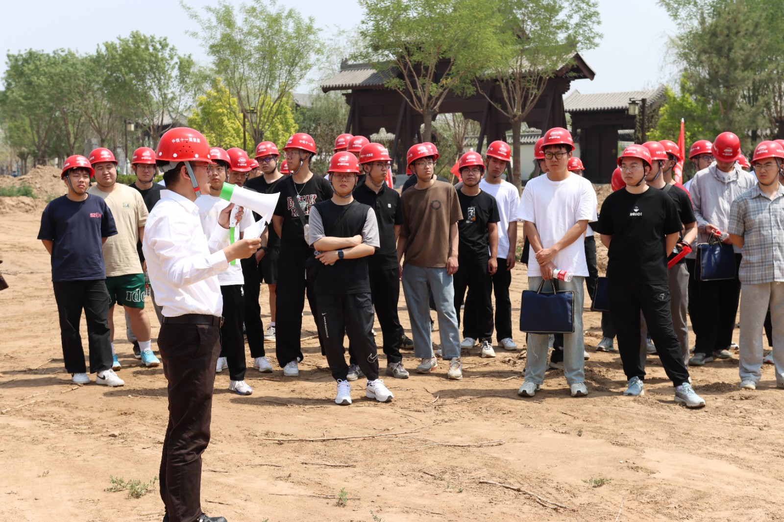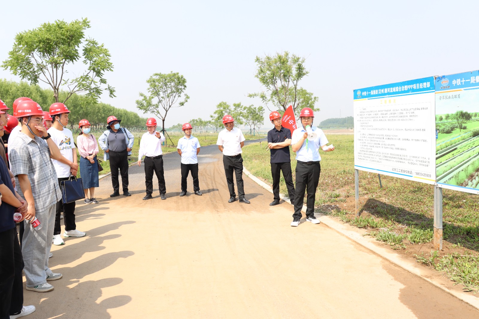 在中铁十一局集团第一工程有限公司副总经理、项目经理鲍大顺和中铁十一局集团第一工程有限公司人力资源部副部长孙岩引领下,师生一行先后观摩了唐河生态水系及其沿岸综合治理项目和定州园博园项目施工现场。项目总工程师李鹏飞、工程管理部部长杨文超分别向师生一行介绍了项目建设的重点难点、工艺流程、安全标准以及质量规范,让同学们对地方基础设施建设项目有了更直观的认识,也对中铁十一局集团精细化管理、高质量发展行动有了更深刻的认识。