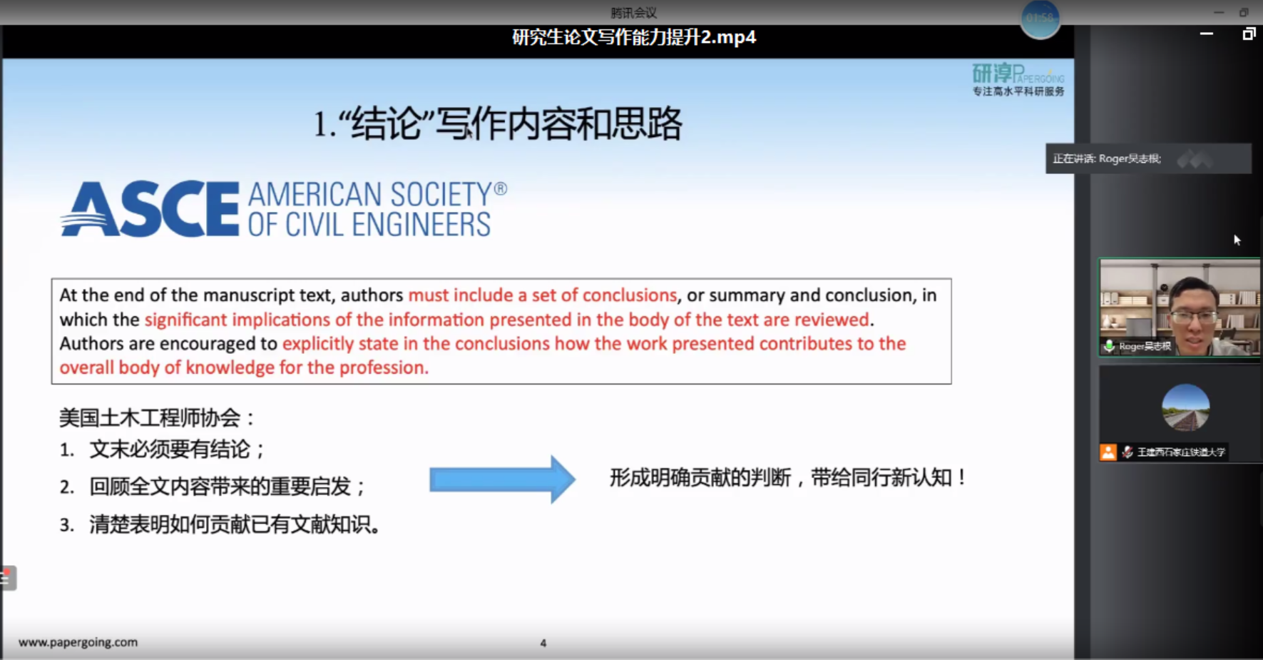 吴志根博士面向土木工程学科的硕士生和博士生,深入分析了高水平论文的结构和内容构思逻辑,并详细讲解了高水平论文题目、摘要、引言、方法、结果和讨论部分、以及投稿信的写作内容和思路,同时介绍如何利用批判性思维提升学术英文写作能力和回复审稿人意见书的质量。吴志根博士采用理论分析结合真实案例讲解的方式,让各位老师和研究生对高水平论文写作和投稿过程中需要注意的细节有了更深入了解,有利于不同发表水平的听众能掌握发表高水平土木工程论文的关键要素。
