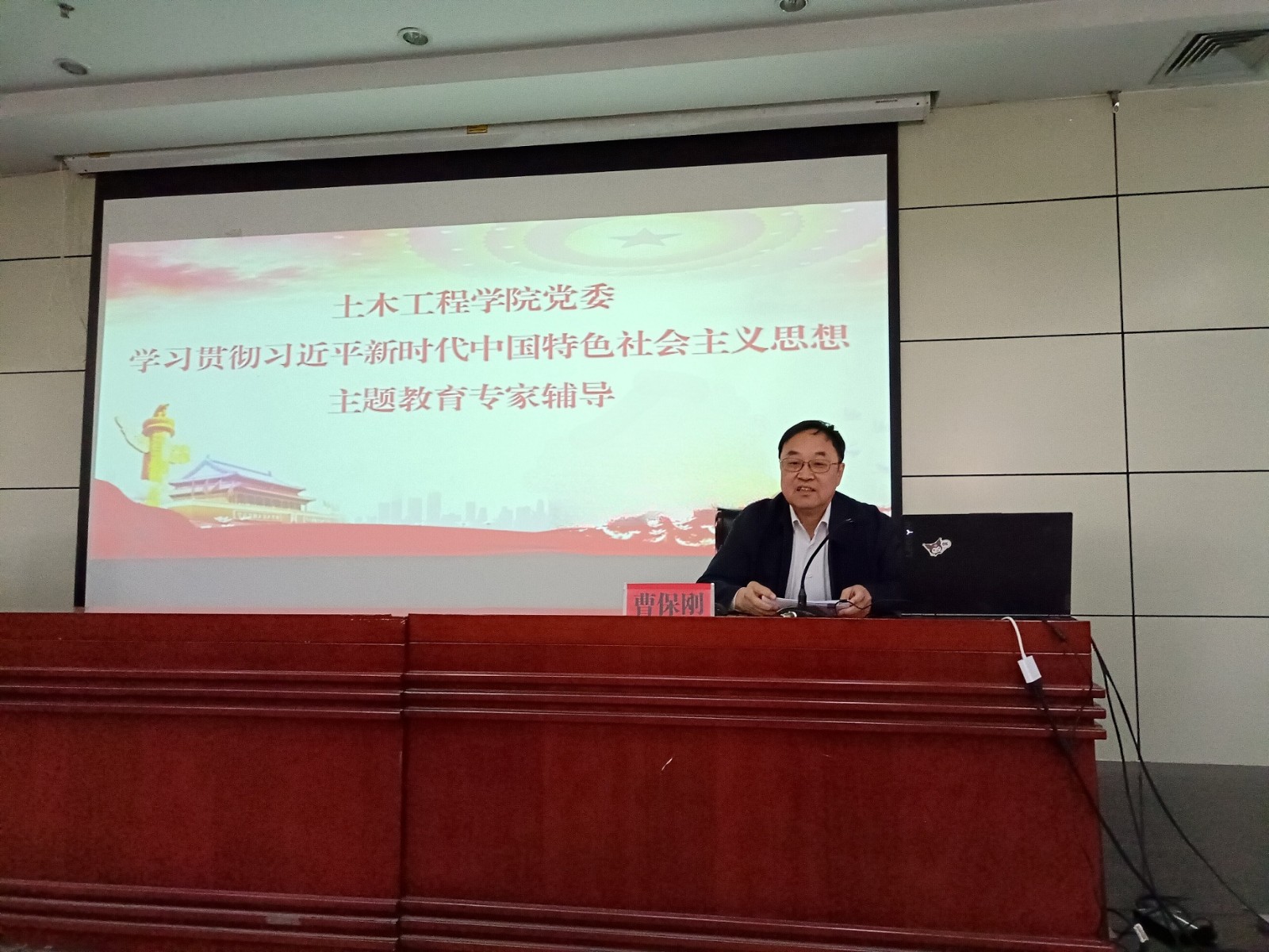 (土木学院)为深入学习贯彻习近平新时代中国特色社会主义思想,确保主题教育理论学习高标准、高质量进行,4月26日下午,土木学院邀请原河北省社会科学院副院长,省社会科学界联合会常务副主席曹保刚到校进行主题教育专家辅导。学院200余名教职工参加,学院党委书记韩东海进行动员讲话,党委副书记王长瑞主持大会。曹保刚从习近平新时代中国特色社会主义思想的科学理论体系、确立产生路径、基本内涵、立场观点方法和鲜明特性