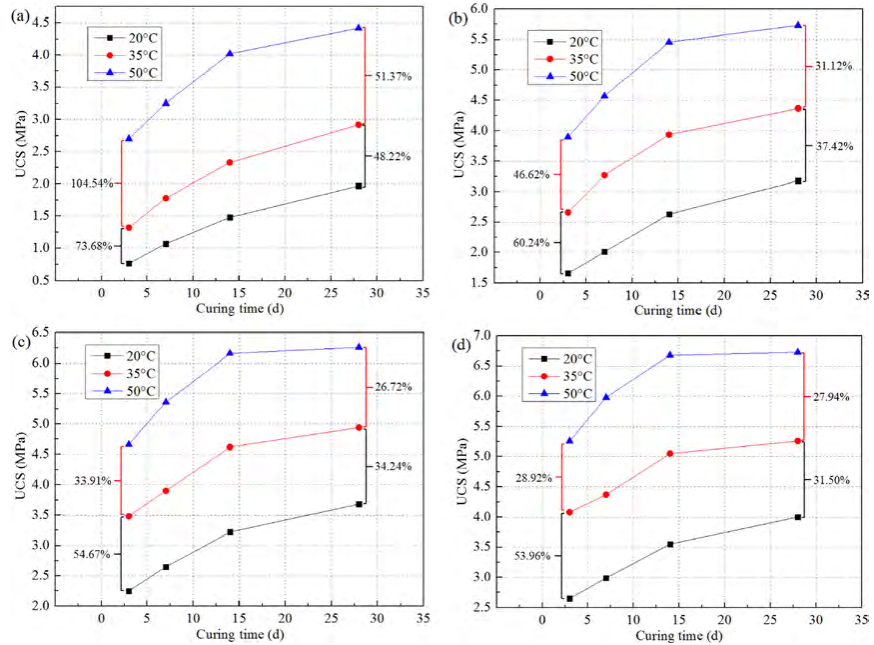 图3 膏体充填体单轴抗压强度与养护温度关系曲线:(a) 0 kPa (b) 180 kPa (c) 360 kPa (d)540 kPa