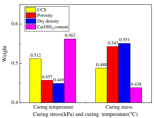 图4 养护压力与养护温度对膏体充填体物理力学性能影响的权重分布