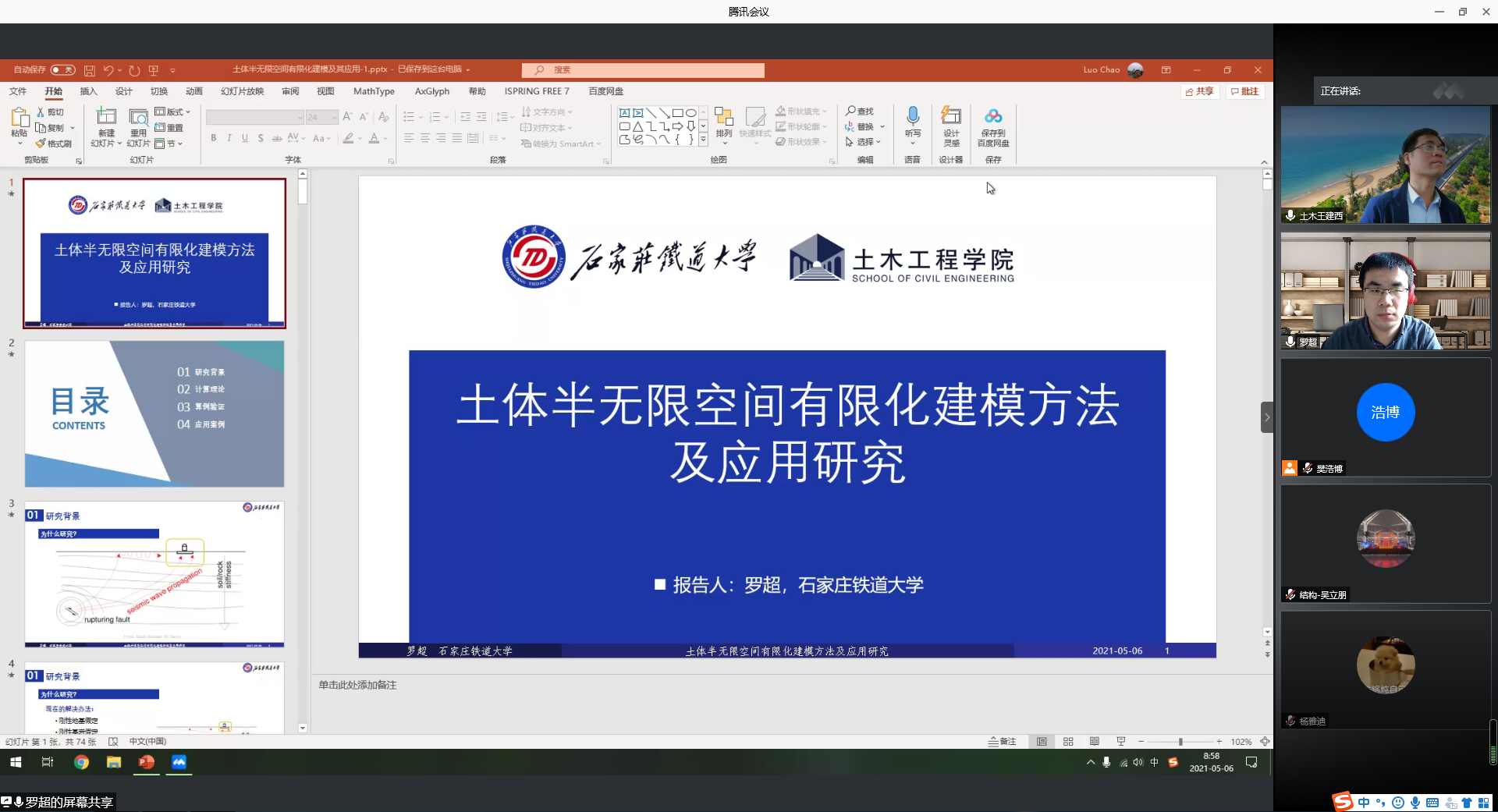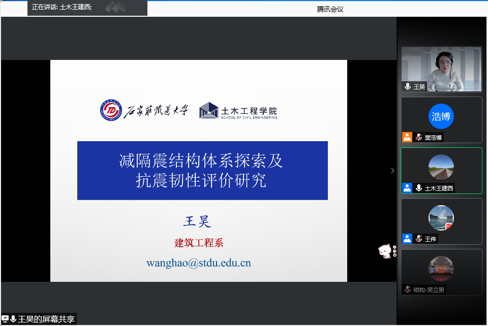 (金年会官网)为了促进青年教师(博士)们的学术交流、开阔师生们的视野,金年会官网于2021年5月6日举办了第9期(网络视频报告)青年教师(博士)学术报告活动。会上,罗超老师作了《半无限空间有限化建模方法及应用研究》的报告,王昊老师作了《减隔震结构体系探索及抗震韧性评价研究》的报告。本期学术报告活动由王建西副院长主持,王伟院长、各系室老师及研究生参加。