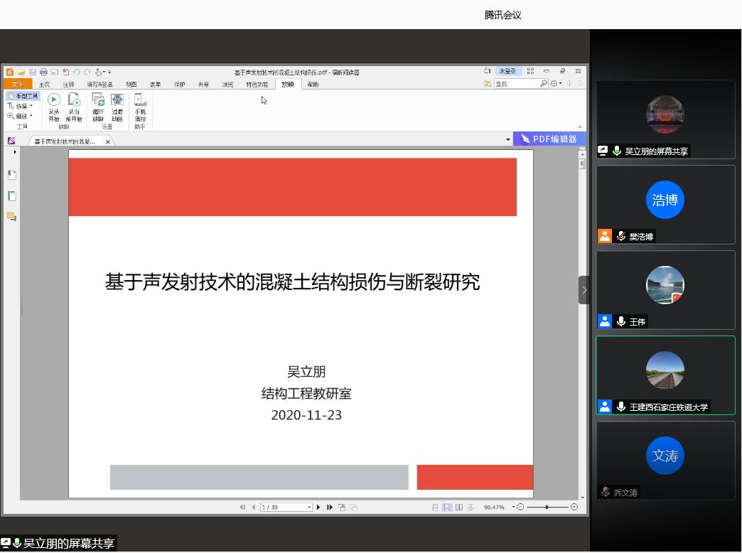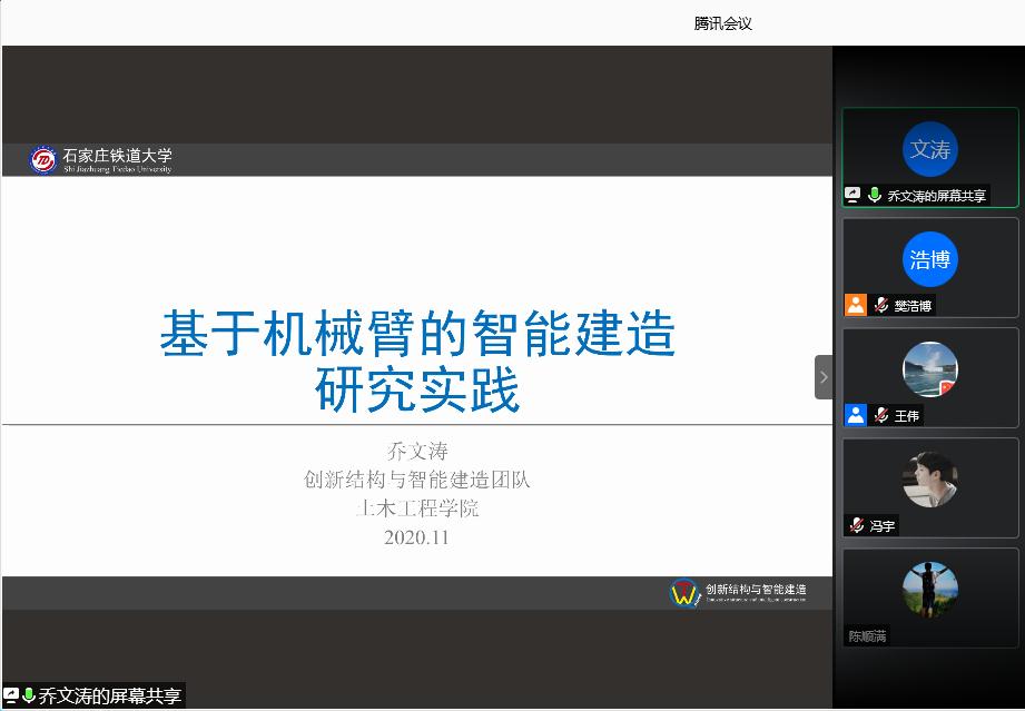 (金年会官网)为促进青年教师(博士)们的学术交流、开阔师生们的视野,金年会官网于2020年11月25日举办了第7期(网络视频报告)青年教师(博士)学术报告活动。会上,乔文涛和吴立朋老师分别作了《基于机械臂的智能建造研究实践》和《基于声发射测试的混凝土梁损伤与断裂研究》的报告。本期学术报告活动由王伟院长主持,王建西副院长及各系室老师参加。