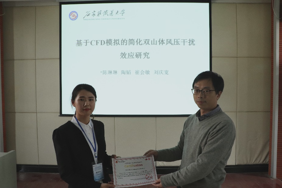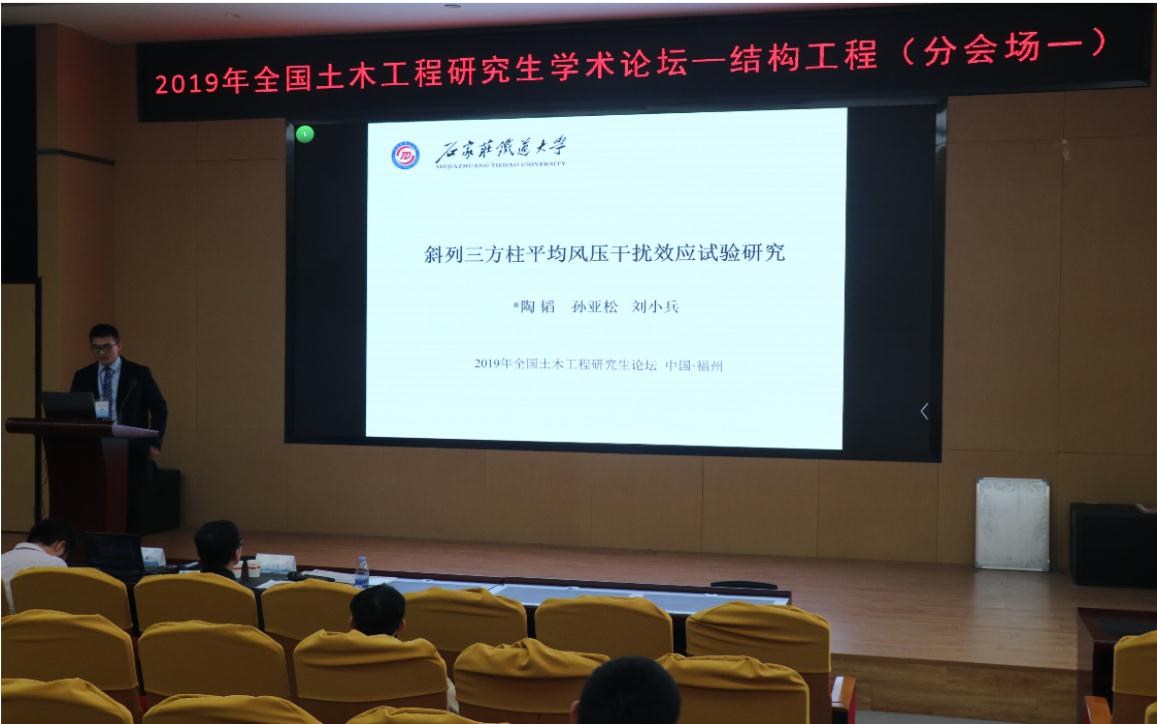 在分会场,金年会学生代表陈琳琳和陶韬分别以“基于CFD模拟的简化双山体风压干扰效应研究”和“斜列三方柱平均风压干扰效应试验研究”为题作了学术报告,得到了参会评委的高度认可。