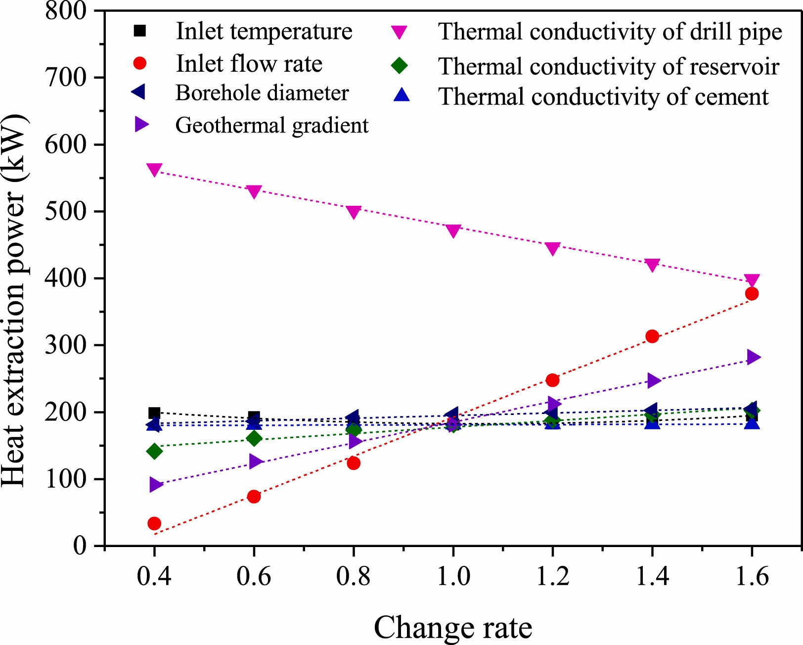 同轴换热器可实现地热资源“取热不取水”开采,可兼顾清洁能源开发与环境保护两方面,具有显著的优势。河北唐山马头营干热岩开发示范区已开展了单井同轴换热试验,但为了获得良好的换热效果、形成相应的开发技术,需要借助于数值模拟开展马头营干热岩单井同轴换热工艺参数优化。研究表明,注入高温工质流体可以显著提高出口温度,而注入低温工质流体则可获得较高的换热功率。出口温度、取热功率与入口流量、水泥导热系数、储层导热系数和钻孔直径呈现二项式关系,与内管导热系数和地热梯度分别呈现线性负相关、正相关关系。入口流速、地温梯度和内管导热系数是最显著的影响因素,其次是储层导热系数和钻孔直径,而入口温度和固井水泥导热系数影响微弱。研究建议选择地热梯度大、导热性好、分布稳定广的储层,开发导热性能高的固井水泥和保温性能好的内管材料,在考虑成本的同时,可酌情降低入口温度、提升工质流体流速、增大井径。