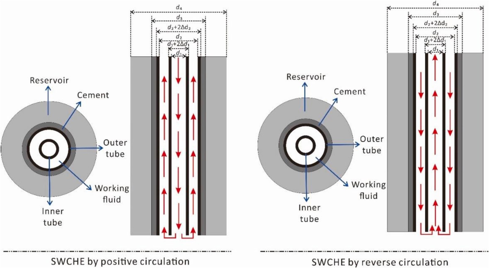 图1 正循环、反循环同轴换热模式示意图