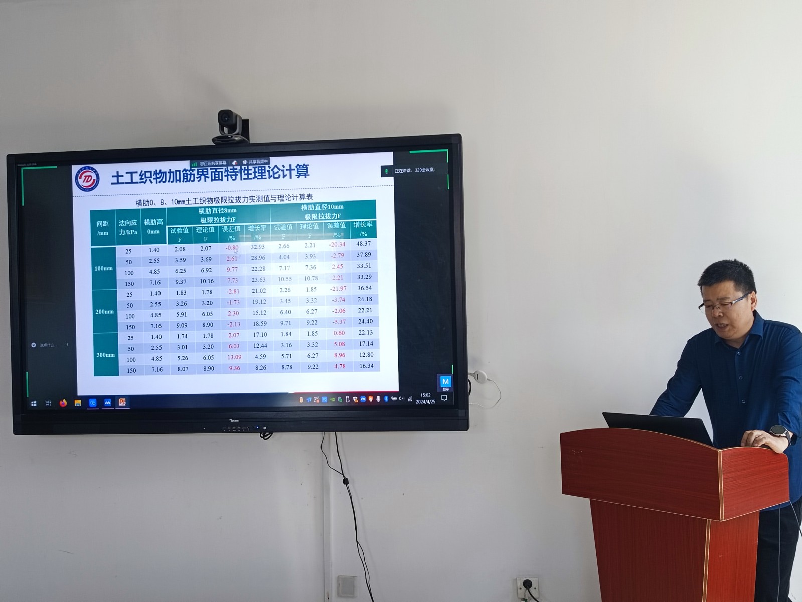 刘伟超老师向与会师生介绍了土工合成材料基本概念和特点、土工织物加筋的现状与界面特性存在的不足,针对性地提出了缝合横肋、改变铺设方式、缝合肋棒等新型的土工织物加筋结构形式,并通过大型直剪试验、拉拔试验等对所提出的几种并把形加筋方式的界面特性进行了测试,对几种新形式对界面特性的提升效果、影响因素、作用机理进行了分析,基于土的抗剪强度理论对改进后的筋土界面强度进行了计算,相关研究成果可为土工织物在加筋工程中的推广应用提供借鉴和指导。