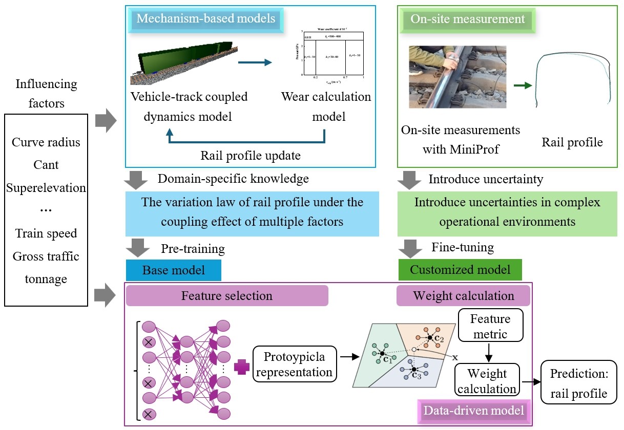 研究论文“A mechanism-data dual-driven approach for predicting profile changes in rails”则创新性地提出了一种机理-数据双驱动的钢轨廓形变化预测方法。该方法的核心创新在于设计了一种分阶段协同机制,有效融合机理模型的物理可解释性与数据驱动方法的非线性映射能力。具体而言,该方法采用迁移学习预训练-微调策略有效融合了物理先验与现场数据的不确定性,并引入自适应噪声增强技术强化局部特征表达,在预训练阶段:嵌入了物理边界条件,形成了跨线路适用的基础模型;在微调阶段:能以少量现场数据快速适配特定线路,显著降低了传统方法因线路差异导致的冗余建模成本。该研究为重载铁路钢轨维护建立了一种平衡物理可信度与运营适应性的智能预测范式。在曲线半径≥400m的轨道上,该方法将预测廓形的平均绝对百分比误差(MAPE)控制在10%以内。