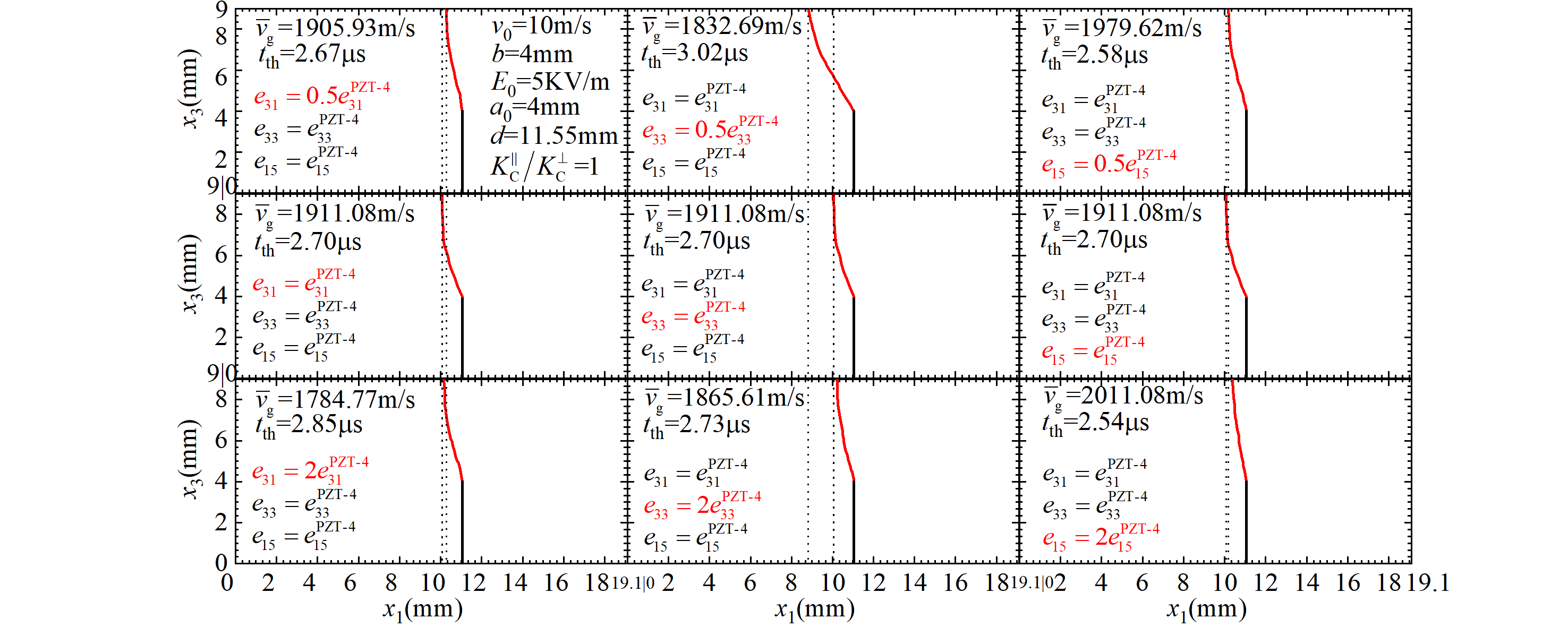 图2 压电材料中压电系数对裂纹动态扩展行为的影响