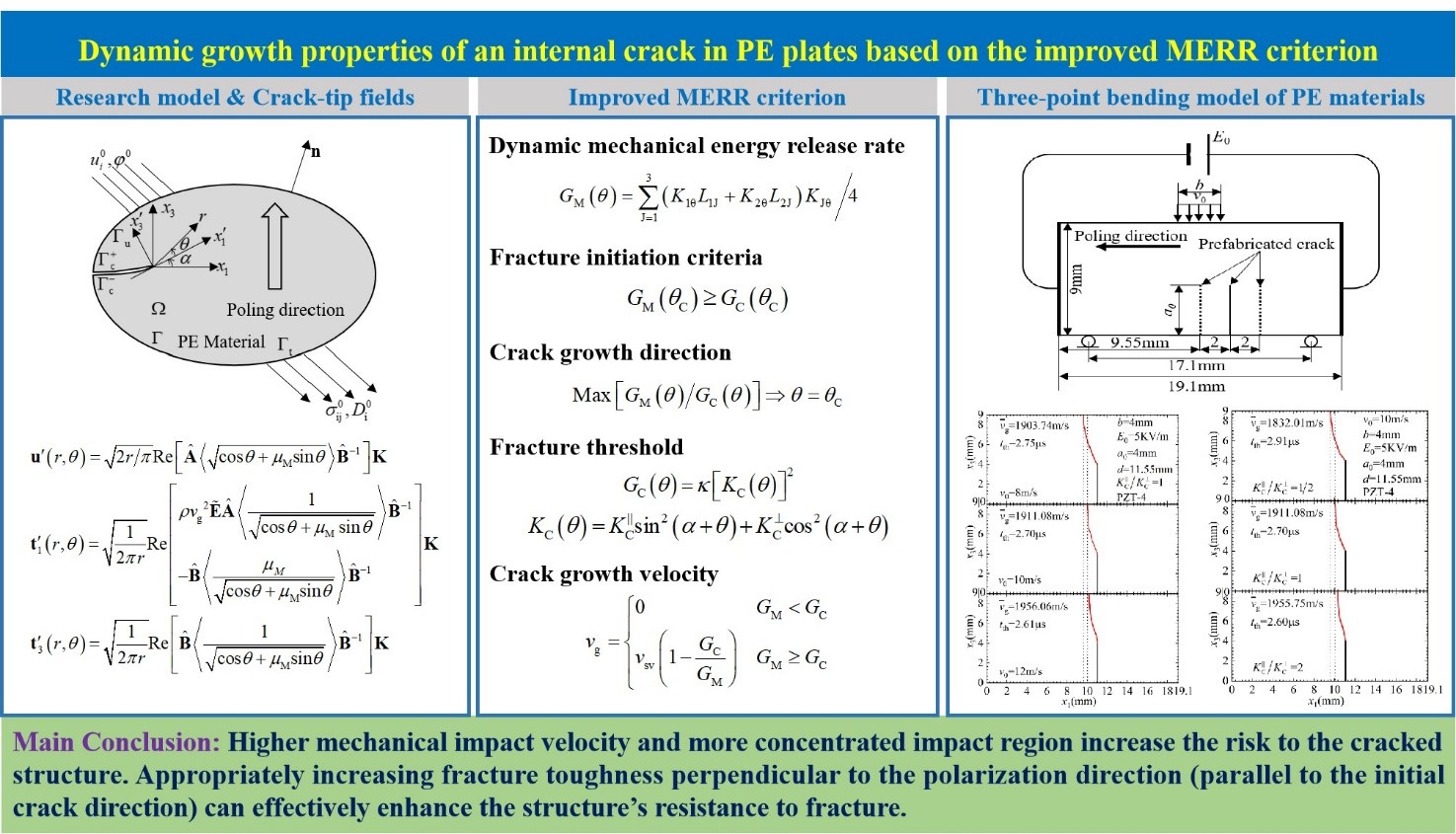 近期,金年会冯文杰教授作为通讯作者,金年会延真老师作为第一作者,在国际权威期刊《Theoretical and Applied Fracture Mechanics》(JCR Q1,Top期刊,中科院1区)上发表题为 “Dynamic growth properties of an internal crack in piezoelectric plates based on the improved mechanical energy release rate criterion”的研究论文。文章研究了压电板内部裂纹在冲击载荷作用下的动态断裂问题,特别关注裂纹在时域内的扩展路径与扩展速度。基于扩展有限元方法、相互作用积分以及Irwin公式,压电板内部裂纹尖端的动态断裂参数得以求解。文章创新地提出并推导了一种改进的机械能释放率判据,用以模拟裂纹动态扩展行为。通过数值算例,本文深入分析了外加力电耦合载荷、结构几何特征以及材料参数对裂纹动态扩展特性的影响。研究表明,较高的机械冲击速度和更集中的冲击区域会增加含裂纹压电结构的失效风险;而适当提高平行于初始裂纹方向的材料断裂韧性,则能够有效提升结构的抗断裂能力。本文所得结论可为压电结构在动态环境中的服役提供理论指导,具有重要的工程实用价值。