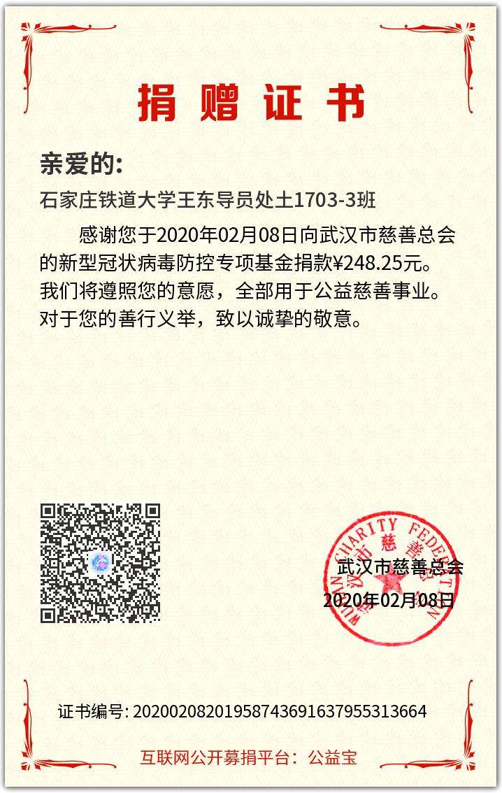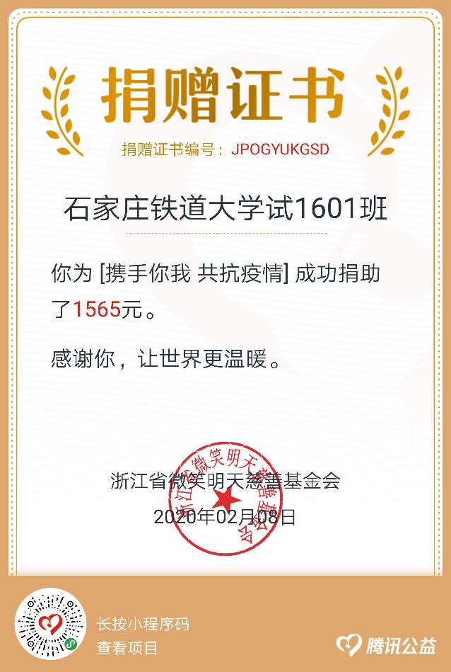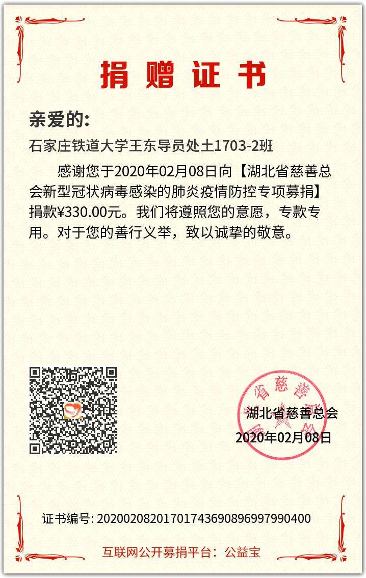 2月9日的时候,各班捐款均已经进行,他们最终决定了捐款的方式、接受捐款的单位,均是以班级的名字为抬头。捐款后还能生成一个电子证书,他们觉得还是挺高兴的,都发到班长群里炫耀了一把。