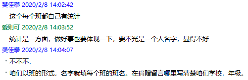 2月8日的时候,所有捐款已经收上来了,他们商量了捐到哪个单位,想捐一个信誉稍好点的单位,说是感觉湖北的红十字会不靠谱,有说韩红基金会的,也有说湖北慈善总会的,后来最终7个班确定捐到湖北慈善总会,而试1601则决定捐到浙江微笑明天慈善基金会。