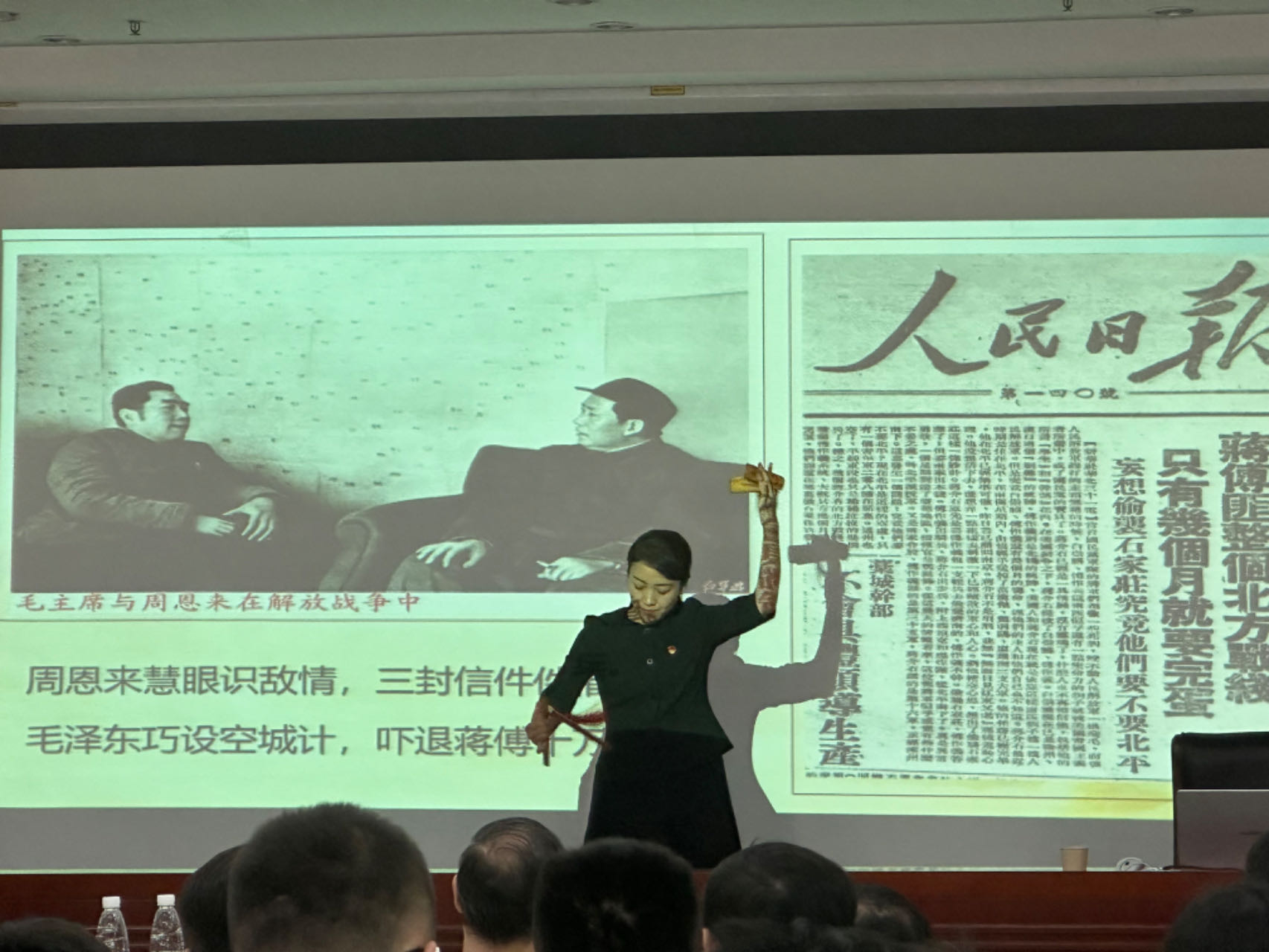 何老师的讲座史料详实,观点鲜明,理论联系实际,鼓舞了全体党员的斗志、激发了大家的爱党爱国热情。讲解由浅入深,由表及里,层层递进,娓娓道来,既有跌宕起伏的故事讲解,又不时穿插民谣与快板,形式新颖,内容丰富,引人入胜,振奋人心。