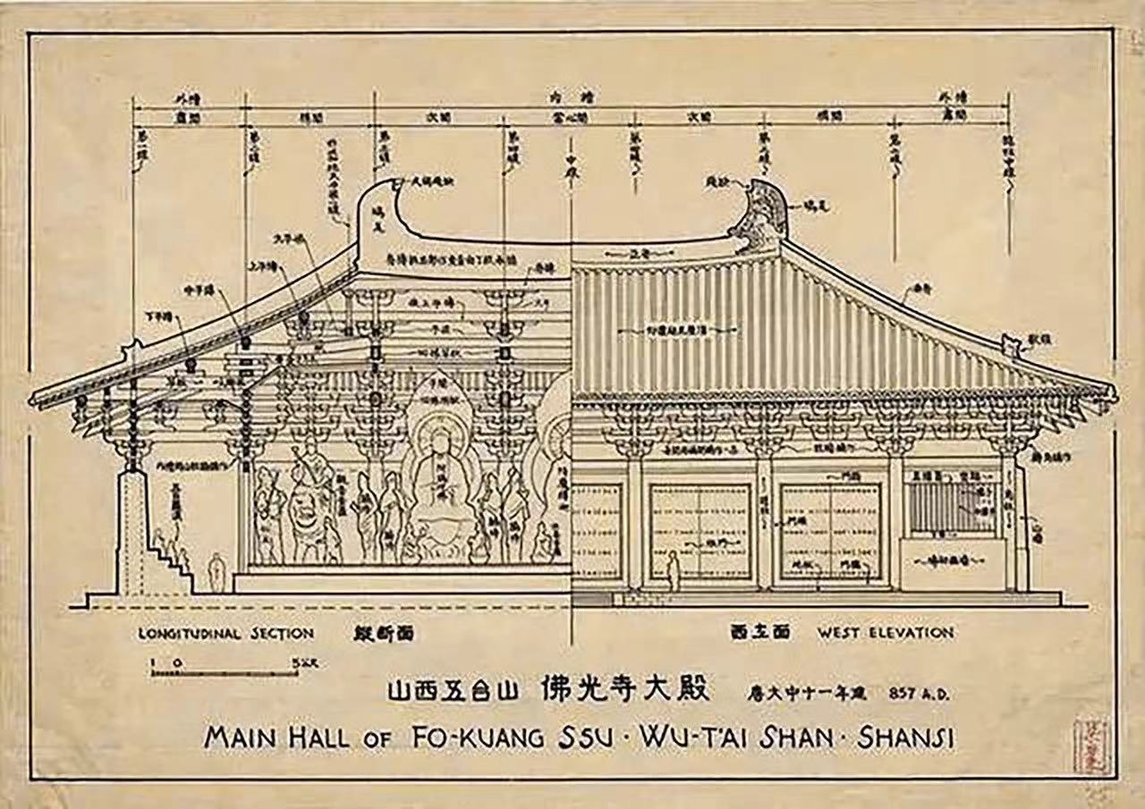 (图四:佛光寺东大殿正立面、剖面图,梁思成绘制)