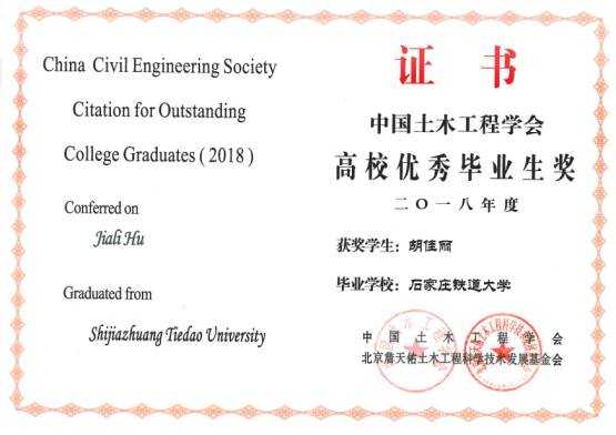 2018年11月24日,由中国土木工程学会教育工作委员会组织的2018年中国土木工程学会高校优秀毕业生奖正式颁奖,金年会金年会官网胡佳丽同学荣获“2018年中国土木工程学会高校优秀毕业生奖”,共有来自清华大学、浙江大学、同济大学等院校的30名2018年土木工程专业毕业生获此奖。