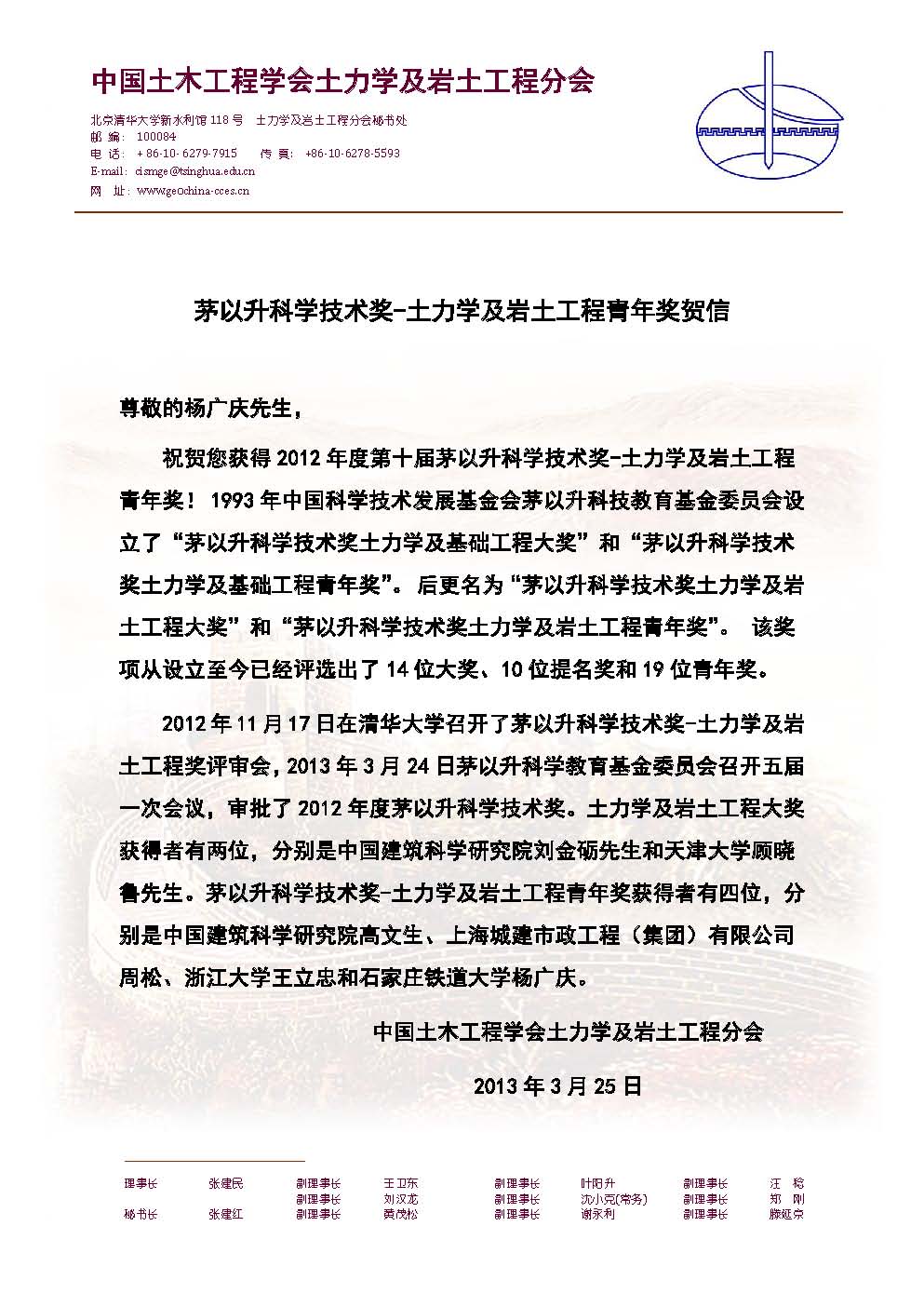 2013年3月24日茅以升科学教育基金委员会召开五届一次会议,审批了2012年度茅以升科学技术奖。金年会杨广庆教授荣获茅以升科学技术奖-土力学及岩土工程青年奖。