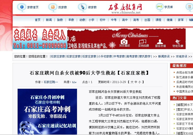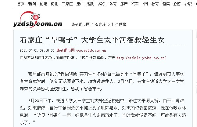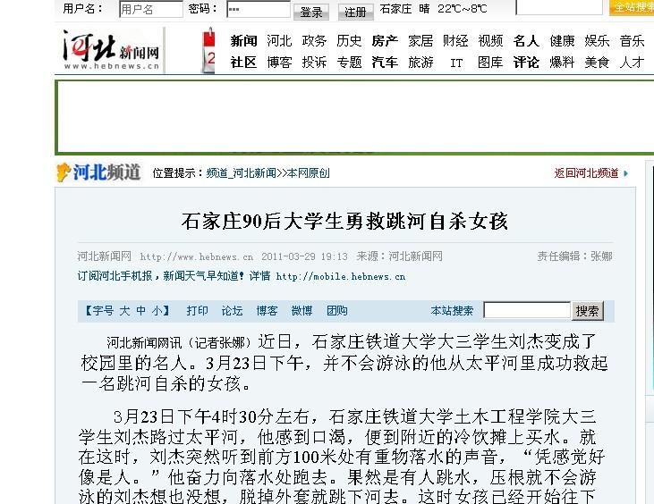 原来当天下午去河北经贸大学看望校友的刘杰,在返校的途中,16时30分左右,路经汊河大桥时,因口渴到桥头神农庄园酒店附近购买了一瓶矿泉水。就在他饮用时,隐约听到扑通一声有东西落水的声音,循声望去,远处的水里有一个人,头忽上忽下,手臂也在不停的摇摆。此时,他心中有一种不祥的预感——有人落水了!他急忙扔了正在饮用的的矿泉水,丢下自行车,飞奔过去。果然一个女孩在水中挣扎,而且女孩的身体已经开始下沉,水面上只留下两条手臂。情况危急,此时他早已忘了自己不习水性,心中只有一个念头,救人要紧。他甩掉上衣毅然纵身跳入冰冷的河水中,在踩不着底的河中几经沉浮,终于抓住了女孩并拼命往岸上拖。因河水刺骨,他身体麻木,四肢僵硬,已力不从心,这时,二人都有沉没的危险。在这千钧一发之际,他用尽全力将女孩拖到了岸边,在岸上人七手八脚的帮助下上了岸。当时女孩脸色发青,嘴唇发紫,陷入昏厥。经过应急抢救,终于脱离了生命危险。