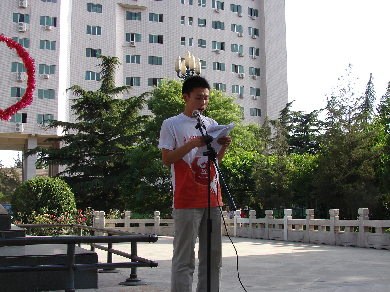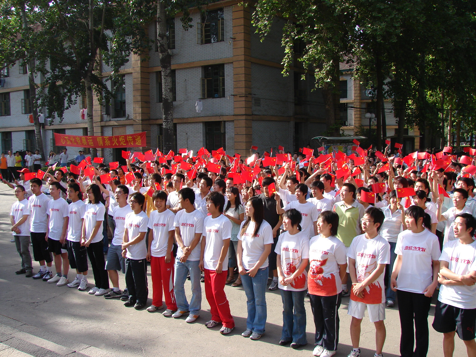 校园模拟奥运圣火传递启动仪式在泽园毛主席像前举行。首先,全体师生向地震灾区的遇难同胞默哀一分钟。院团委王洪军书记为本次活动发表了热情洋溢的开幕词,随后由土木分院青年志愿者协会主席刘振鹏同学代表29名模拟火炬手发言。在同学们“中国加油,北京加油,我爱祖国,支持奥运”的欢呼声中,院学生处高晓峰处长宣布“石家庄铁道学院校园模拟奥运圣火传递活动正式开始”后,院学生处高晓峰处长亲手点燃了火炬,由教师代表石家庄铁道学院工程力学系副主任段淑敏教授开始了第一棒的火炬接力。在29名火炬手中,有奋斗在教育第一线获得全国力学教学优秀教师、河北省优秀教师的教师代表段淑敏老师、有获得全国见义勇为优秀大学生杨之亚同学、有在河北省大运会获得金牌的体育健儿吕书庆同学、有来自汶川大地震灾区德阳市的学生代表陈建同学、有获得全国先进班集体班级的学生代表、有获得铁道部茅以升奖学金获得者河北省三好学生代表,火炬手学生代表来自12个分院、系的优秀学生,他们代表着铁院来自30个省市2万多名师生。“中国,加油!”、“北京,加油!”、“众志成诚,抗震救灾!”、“四川,加油!”一句句口号回荡在人群中,上千人的呐喊响彻校园,数千面鲜艳的五星红旗汇成了欢乐的海洋。29人在周围同学的簇拥下,把奥运火炬传递 ,更是把爱心传递,把祝福传递!