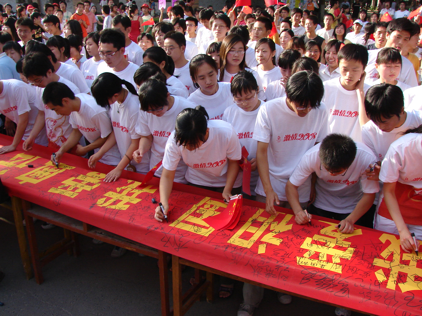 经过了近一个小时,火炬传递回了出发点,在这里,由陈明长书记把圣火盆点燃。此时此刻,掌声雷动,所有人的热情都凝聚在了这熊熊燃烧的火焰中。大家为奥运欢呼,为奥运祝福,更为祖国的强盛骄傲、自豪。同时现场师生在条幅签名,写下了自己的对奥运和汶川地震遇难同胞的祝福。