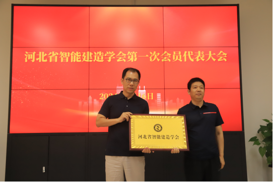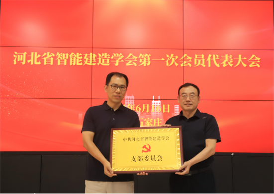 蒋栋为中共河北省智能建造学会党支部授牌,秦昌辉为河北省智能建造学会授牌。