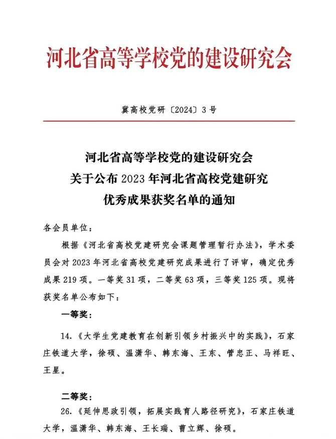 近日,2023年河北省高校党建研究课题优秀成果获奖结果公布,我院两个课题获优秀成果奖,其中徐硕老师主持的《大学生党建教育在创新引领乡村振兴中的实践》项目荣获河北省高校党建研究优秀成果一等奖;温潇华老师主持的《延伸思政引领,拓展实践育人路径研究》项目荣获河北省高校党建研究优秀成果二等奖。荣誉的取得,是我院党建工作者辛勤努力和智慧的结晶,展示了我院在党建研究领域的实力和水平。
