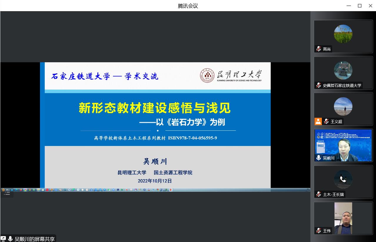 2022年10月13日,金年会官网“龙山·土木前沿论坛”第三期邀请了昆明理工大学国土资源工程学院院长、长江学者吴顺川教授做题为“新形态教材建设感悟与浅见——以《岩石力学》为例”的学术报告。本次报告通过线上线下相结合的方式进行,由土木学院院长王伟主持,相关院系专业教师和研究生200余人参加会议交流。