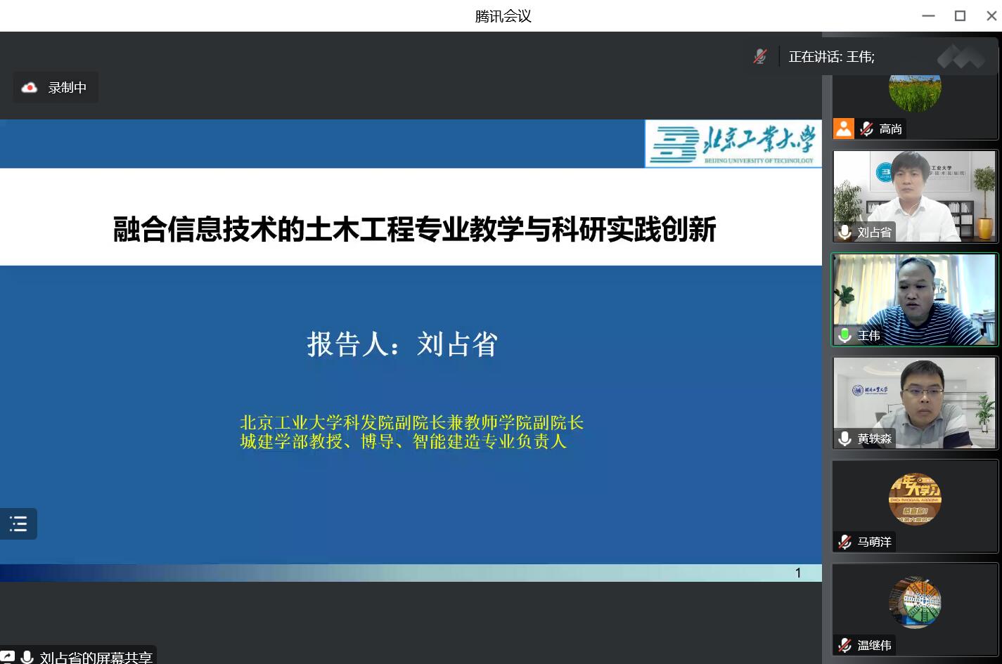 刘占省教授首先对北工大城市建设学部的沿革与现状进行了介绍,并分享了城市建设学部近年来在土木工程专业信息化改革教学实践中的成果与创新;最后重点介绍了北工大智能建造专业建设与人才培养经验,分别从信息技术高速发展的行业背景与国家发展战略、传统工科升级改造的新工科建设、智能建造专业培养方案、系列教材编写、校企多方协同育人与学生竞赛-科技创新-教师教研交互模式等多方面进行了经验分享。