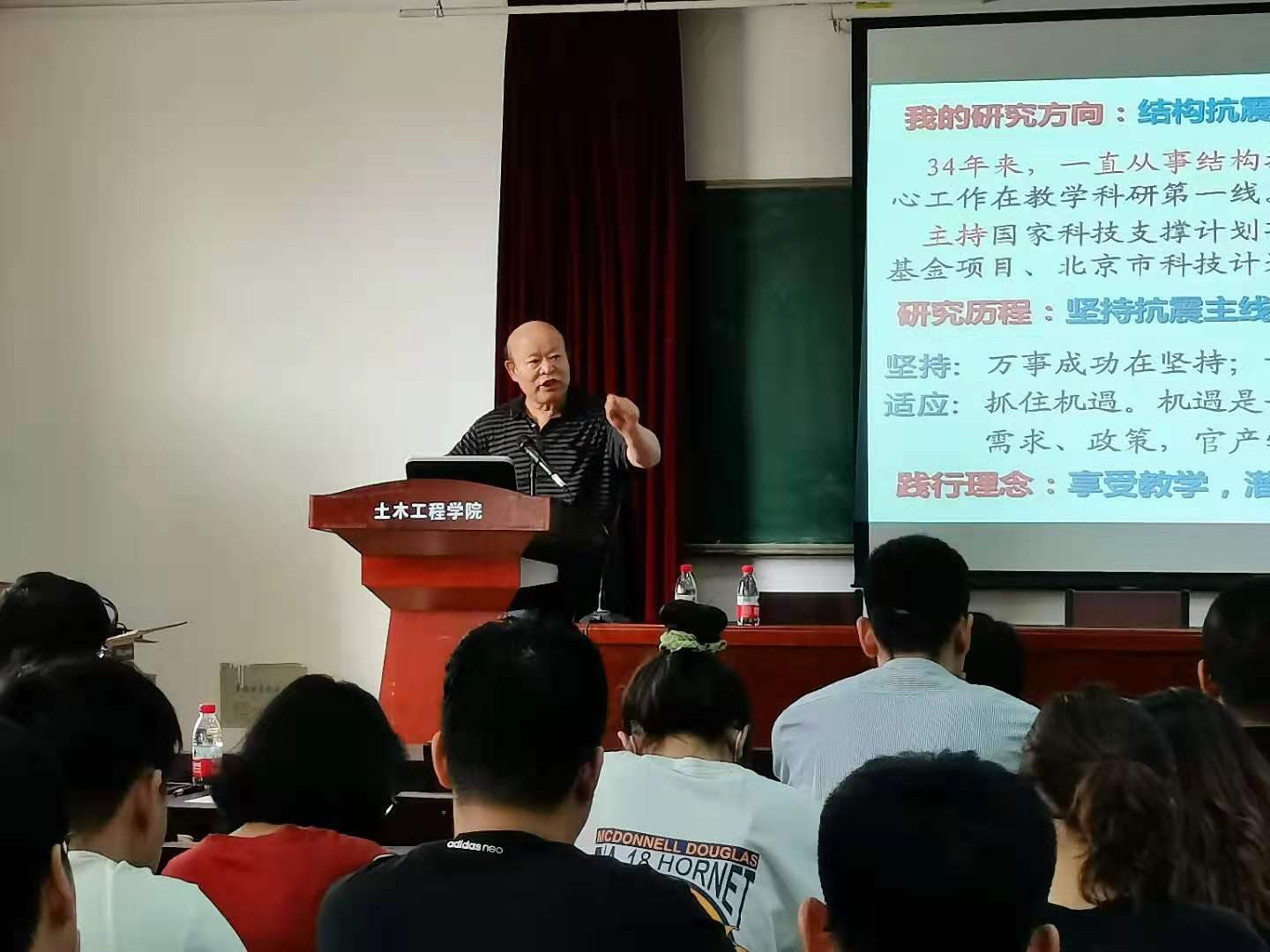 曹万林教授以创新与工程能力培养、科研策略与科研选题、产教融合与工程案例、教研相长与创新发展四个方面为主要内容展开报告。他从科研创新能力培养切入话题,鼓励学生们打好理论基础、保持开创精神、注重工程背景和现场交流、拓展科学思维。随后,他结合天津高银117大厦,大连国际会议中心等多个著名建筑实例,向大家介绍了关于大型复杂超高层建筑组合结构高效抗震、多筒支承超大平台高层建筑组合结构抗震以及村镇建筑低成本抗震节能体系等相关理论与技术,并讲述了自己丰富的试验和实践经历,他无畏艰难、敢想敢做、亲力亲为的精神深深地感染了在场的青年教师和同学们,让听众感受到了技术革新对产业发展带来的巨大影响。