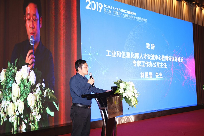 当天下午的颁奖盛典中,工业和信息化部人才交流中心教育培训处处长、专家工作办公室主任林恩雪代表大会对本次大赛的获奖院校及企业表示祝贺,并指出:去年BIM大赛的影响,使得参赛人员的队伍更加壮大,在业内已经建立起了品牌的影响力。但是在看到成绩的同时,我们还要思考:如何解决BIM发展中的人才紧缺问题,如何把BIM真正地做成促进中国实体经济转型升级发展的抓手。针对这些问题,只有立足经济发展大势主动培养人才,深入推进产教融合建设,才能在在经济低谷时助力实体经济再上新台阶。