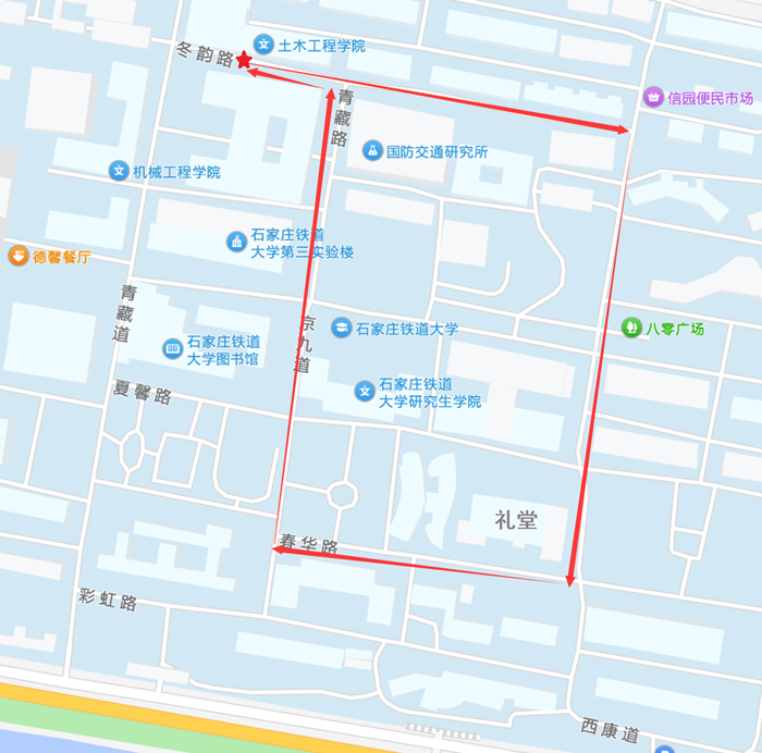 土木楼大门(起点)东行——(到信园门口)沿西康道南行——(到大礼堂)沿春华路西行——(第一教学楼东侧)沿京九道北行——(过图书馆东侧、交通楼西门)——土木楼(结束)。